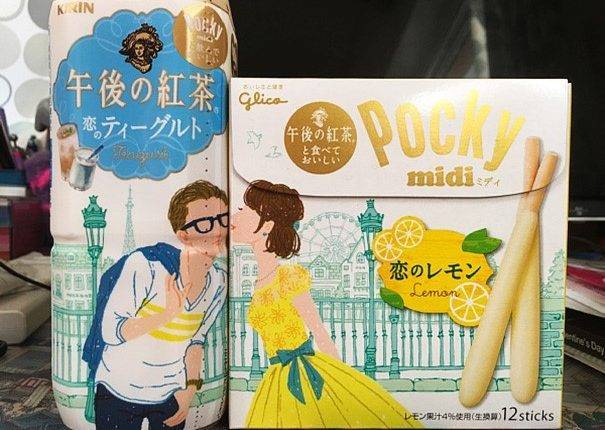 Mỗi khi đặt trà teagurt bên cạnh một hộp Pocky hương chanh, hai nhân vật trên bao bì sẽ trao nhau một nụ hôn.